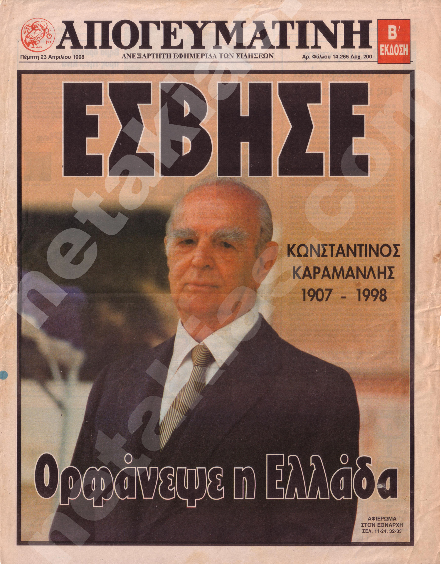 Είκοσι πέντε χρόνια πέρασαν από την 23η Απριλίου 1998 όταν ανήμερα του Αγίου Γεωργίου, ο Κωνσταντίνος Καραμανλής με τον γνώριμο βηματισμό του πέρασε αποφασιστικά στην Ιστορία, αφήνοντας πίσω τα εγκόσμια.