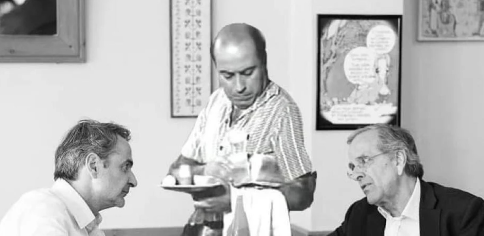 Σε ταινία με πρωταγωνιστή τον αξέχαστο Θανάση Βέγγο παραπέμπει η θεματολογία της συνάντησης του Κυριάκου Μητσοτάκη με τον Αντώνη Σαμαρά στην ταβέρνα «Θίασος» στην Καλαμάτα.