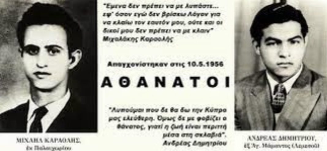 Ο Μιχαλάκης Καραολής και ο Ανδρέας Δημητρίου υπήρξαν οι πρώτοι αγωνιστέςτου Κυπριακού Αγώνα που καταδικάσθηκαν σε θάνατο και εκτελέστηκαν από τους άγγλους δυνάστες. Ο Μιχαλάκης Καραολής γεννήθηκε στις 13 Φεβρουαρίου 1933 στο Παλαιοχώρι Πιτσιλιάς και ήταν το τέταρτο παιδί του Σάββα και της Παναγιώτας Καραολή. Αποφοίτησε από την Αγγλική Σχολή Λευκωσίας και διορίστηκε δημόσιος υπάλληλος. Παράλληλα, ασχολήθηκε με τον στίβο ως αθλητής του ΑΠΟΕΛ. Εντάχθηκε από τους πρώτουςστην ΕΟΚΑ και πήρε μέρος στον απελευθερωτικό αγώνα με την ομάδα του Πολύκαρπου Γεωρκάτζη. Στις 28 Αυγούστου 1955, μαζί με τον συναγωνιστή του Ανδρέα Παναγιώτουσκότωσαν τον αστυνόμο προδότη Ηρόδοτο Πουλλή, την ώρα που παρακολουθούσεμια συγκέντρωση του ΑΚΕΛ. Σημειώνεται ότι οι οπαδοί του ΑΚΕΛ, ήταν αυτοί που παρεμπόδισαν τον Καραολή να διαφύγει ρίχνοντας το ποδήλατο διαφυγής του στα πόδια του. Παρ΄ όλα αυτά ο Καραολής σαν πρωταθλητής στίβου του ΑΠΟΕΛ κατόρθωσε να διαφύγει και αυτός. Με βάση τον αριθμό εγγραφής του ποδηλάτου και τις περιγραφές των Ακελικών συνελήφθη και τον οδήγησαν στην αγχόνη … Ο Παναγιώτου διέφυγε, ενώ ο Καραολής συνελήφθη αργότερα σε ενέδρα από τις αγγλικές δυνάμεις και φυλακίστηκε στις Κεντρικές Φυλακές Λευκωσίας. Στις 28 Οκτωβρίου καταδικάσθηκε σε θάνατο, παρότι η σφαίρα που σκότωσε τον ελληνοκύπριο αστυνομικό προέρχοταν από το όπλο του Παναγιώτου. Οι Αγγλοι δεν του συγχώρησαν ότι κατά τη διάρκεια της ανάκρισης δεν είχε αποκαλύψειτους συναγωνιστές του. Ο Ανδρέας Δημητρίου γεννήθηκε στις 18 Σεπτεμβρίου 1934 στον Άγιο Μάμα Λεμεσού και καταγόταν από πάμπτωχη πολυμελή οικογένεια. Φοίτησε για τρία χρόνια στο Νυχτερινό Γυμνάσιο Αμμοχώστου και στη συνέχεια έπιασε δουλειά σε κατάστημα εκρηκτικών και κυνηγετικών ειδών. Από μικρός αναμίχθηκε στον συνδικαλισμό και διετέλεσε γραμματέας της Συντεχνίας Αχθοφόρων. Νεαρός αγωνιστής της ΕΟΚΑ, πρωτοστάτησε στην αρπαγή οπλισμού από τις κατοχικές αρχές της Αμμοχώστου. Τα όπλα προωθήθηκαν σε διάφορες αντάρτικες ομάδες, οι οποίες μέχρι τότε ήταν εφοδιασμένες σχεδόν μόνο με κυνηγετικά. Στις 22 Νοεμβρίου 1955 κατηγορήθηκεότι πυροβόλησε και τραυμάτισε στην Αμμόχωστο τον πράκτορα της «ΙντέλιτζενςΣέρβις», Σίντνεϊ Τέιλορ. Συνελήφθη και καταδικάσθηκε σε θάνατο. Στις 10 Μαΐου 1956, ο Μιχαλάκης Καραολής και ο Ανδρέας Δημητρίου απαγχονίστηκαν στις Κεντρικές Φυλακές της Λευκωσίας. Η γενναία στάση τους μπροστά στους δημίους τους και το γεγονός της θανάτωσής τους προκάλεσαν παγκόσμια αντίδραση και κατακραυγή. Την προηγούμενη μέρα (9 Μαΐου 1956) στην Αθήνα, 4 άνθρωποι έχασαν τη ζωή τους από τις συγκρούσεις αστυνομικών και διαδηλωτών, που ζητούσαν την Ένωση της Κύπρου με την Ελλάδα. Προς τιμήν των δύο ηρώων, πολλοί δρόμοι στην Ελλάδα και την Κύπρο φέρουν το όνομά τους. Ο μαρτυρικός τους θάνατος θα στιγματίζει για πάντα τους Βρετανούς, αυτούς που τους κατέδωσαν και πρόδωσαν αλλά και αυτούς τους ηγέτες «έλληνες», που δήλωναν ότι «Η ΕΛΛΑΣ ΑΝΑΠΝΈΕΙ ΜΕ ΔΥΟ ΠΝΕΥΜΟΝΕΣ. ΤΟΝ ΜΕΝ ΑΜΕΡΙΚΑΝΙΚΟ, ΤΟΝ ΔΕ ΑΓΓΛΙΚΟ. ΔΕΝ ΕΙΝΑΙ ΔΙΑΤΕΘΕΙΜΈΝΗ ΝΑ ΠΑΘΕΙ ΑΣΦΥΞΙΑ ΛΟΓΩ ΤΟΥ ΚΥΠΡΙΑΚΟΥ …»