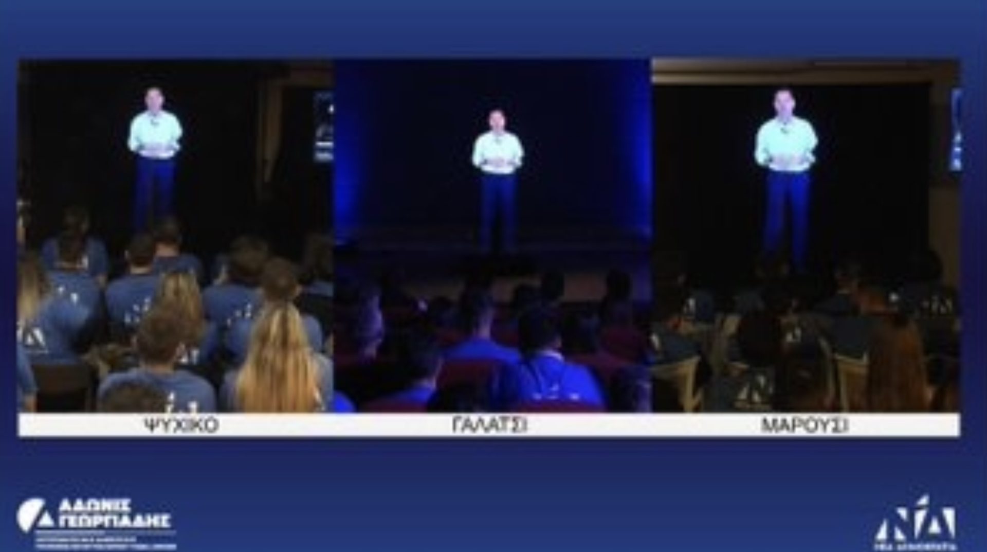 Ο Αδωνις με την χρήση της τεχνολογίας βρέθηκε λοιπόν ταυτόχρονα σε τρια σημεία ενώ στην πραγματικότητα ήταν σε ένα γραφείο με πολυτελή εξοπλισμό στούντιο, εντυπωσιάζοντας όσους τον παρακολούθησαν.