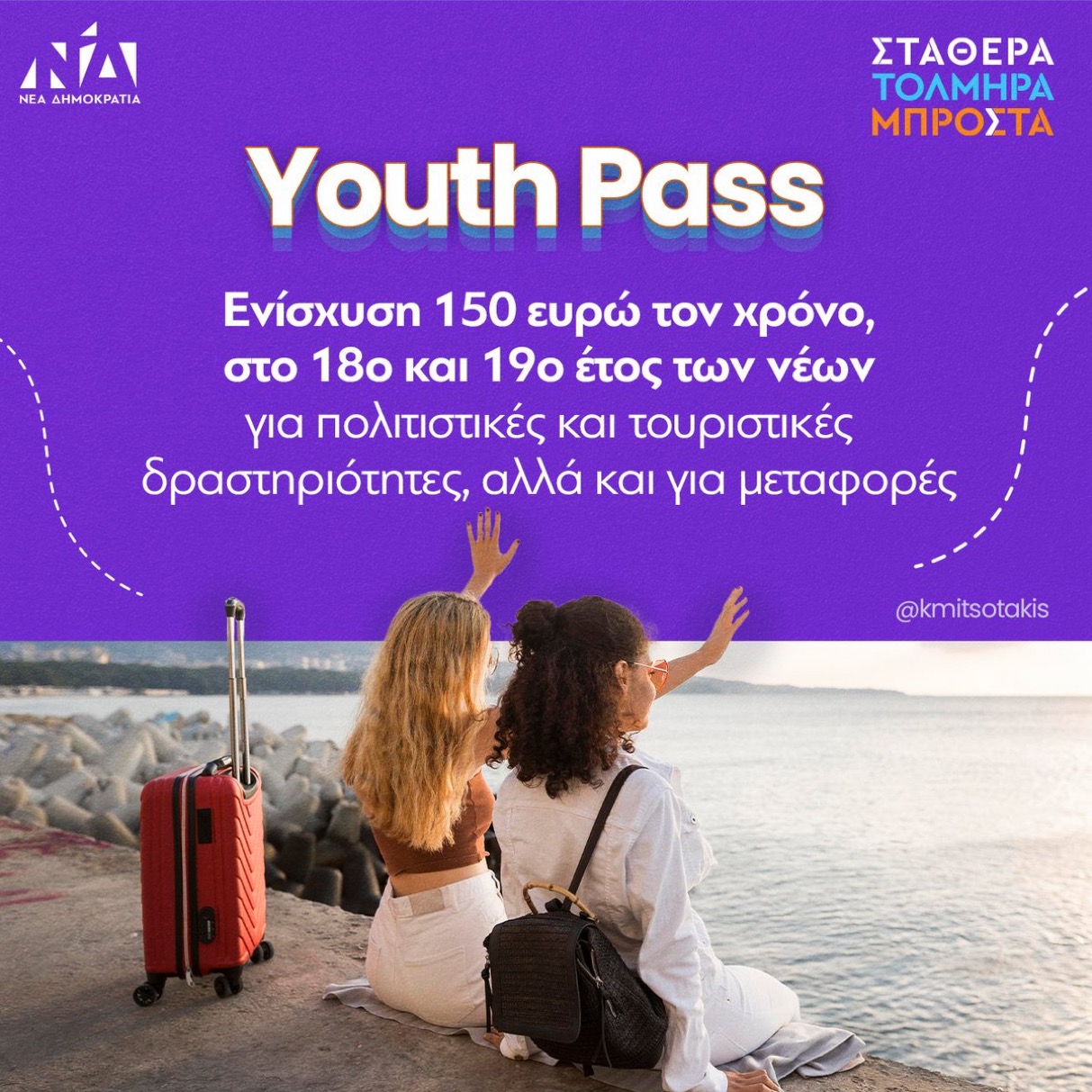 Ενισχύουμε τους νέους μας 18 και 19 ετών, με 150 ευρώ τον χρόνο, τα οποία θα μπορούν να δαπανήσουν σε ένα ταξίδι ή σε μία υπηρεσία πολιτισμού. Έτσι, ενισχύουμε παράλληλα και την ελληνική οικονομία, αφού τα χρήματα αυτά θα δαπανηθούν σε εγχώριες υπηρεσίες.