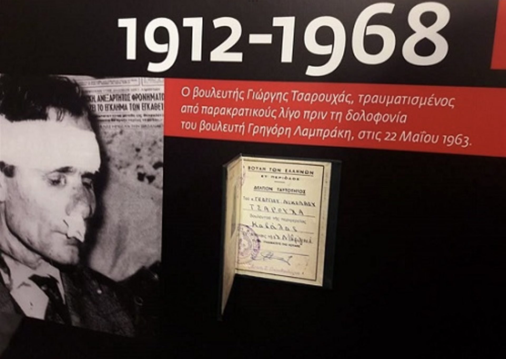 Στις 27 Μαΐου του 1963, το βράδυ της δολοφονίας του Γρηγόρη Λαμπράκη, ο Γιώργος Τσαρουχάς δέχτηκε και αυτός επίθεση, ενώ κατευθυνόταν στην αίθουσα που θα μιλούσε ο Λαμπράκης, με αποτέλεσμα να τραυματιστεί στο κεφάλι και να μεταφερθεί αιμόφυρτος στο νοσοκομείο όπου νοσηλεύτηκε 29 ημέρες. Ήταν δε βασικός μάρτυρας κατηγορίας στη δίκη των δολοφόνων του Λαμπράκη.
