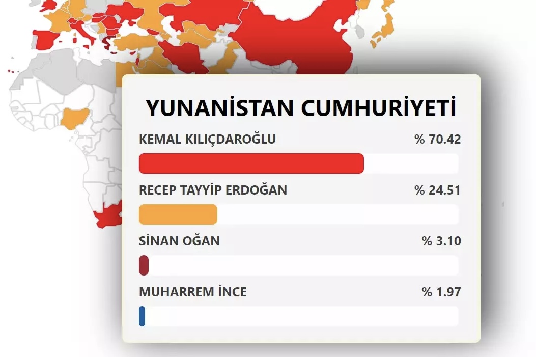 Παράλληλα, τον ηγέτη της τουρκικής αντιπολίτευσης επέλεξαν και οι Τούρκοι που διαμένουν σε ΗΠΑ, Καναδά, Αυστραλία, Ισπανία, Ιταλία, Βρετανία, Ουκρανία, Σουηδία και Φινλανδία, ενώ όσον αφορά εκείνους που ζουν σε χώρες όπως η Ρωσία, η Γαλλία, η Γερμανία, ψήφισαν κατά κύριο λόγο τον Ερντογάν.