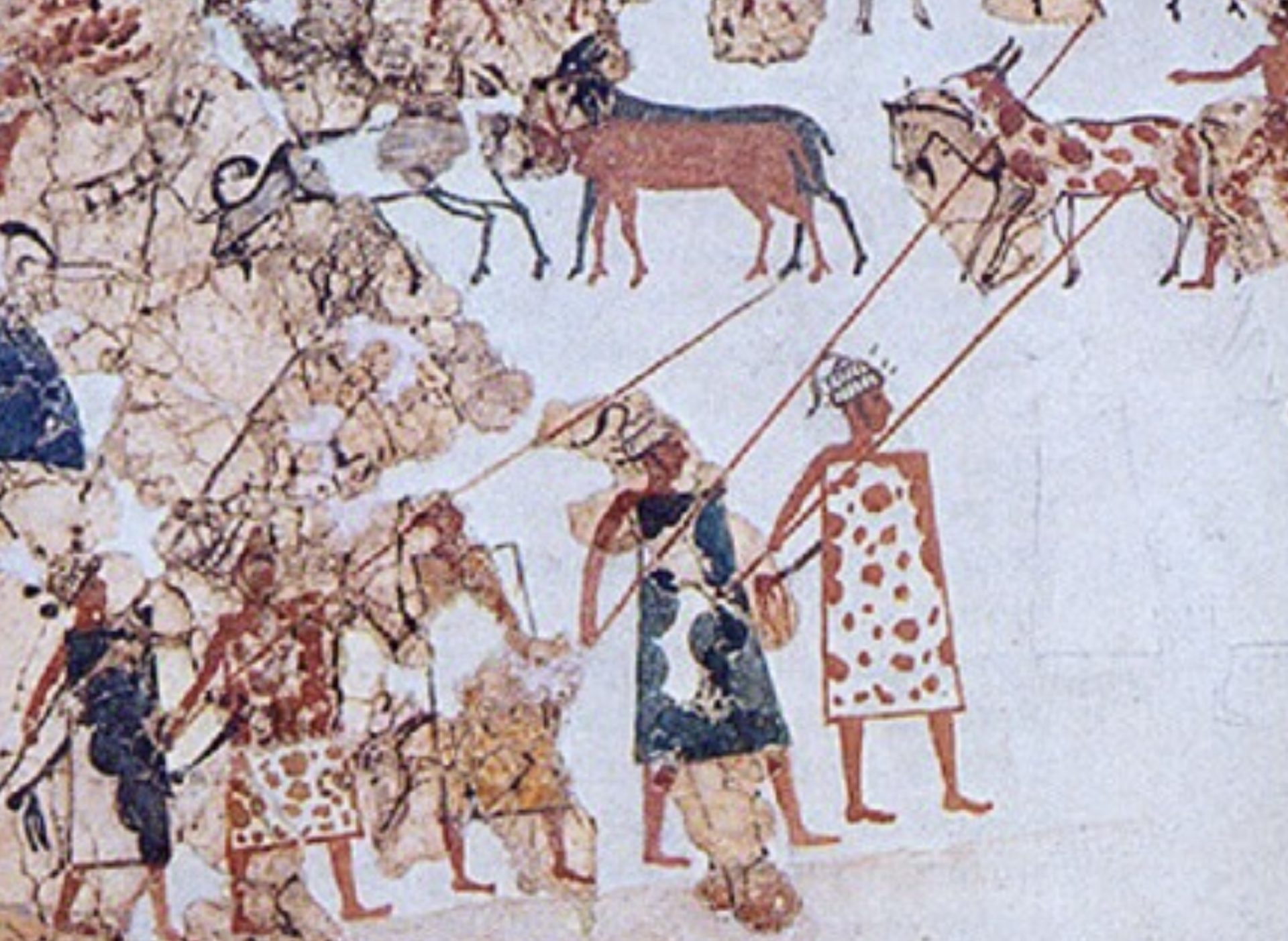 Φωτογραφία: Έλληνες φαλαγγίτες πολεμιστές του 17ου αι. π.Χ. Φέρουν μακρά δόρατα και ποδήρη ασπίδα τύπου «σάκου». Λεπτομέρεια από την περίφημη «τοιχογραφία της Νηοπομπής» από το Ακρωτήρι της Θύρας.