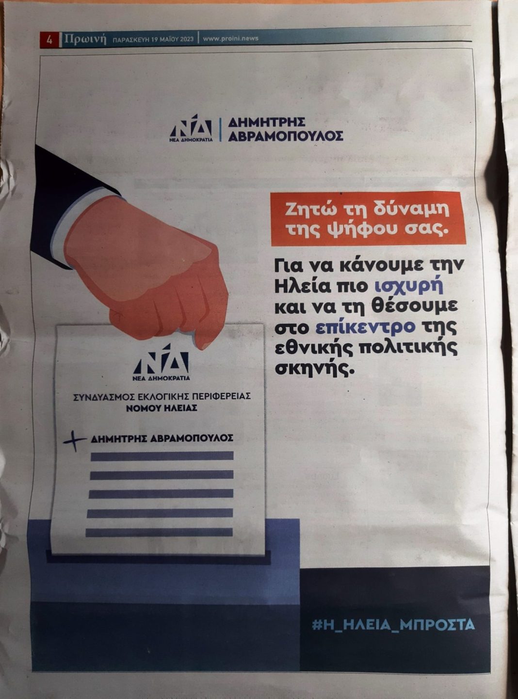 Σάλο έχει προκαλέσει στους ψηφοφόρους της ΝΔ στην Ηλεία η… απίστευτη πληρωμένη ολοσέλιδη διαφήμιση στις τοπικές εφημερίδες του υποψήφιου βουλευτή Δημήτρη Αβραμόπουλου μέσω της οποίας εξαφάνισε ως δια μαγείας τους υπόλοιπους υποψήφιους «γαλάζιους» βουλευτές και παρέμεινε στο ψηφοδέλτιο μόνο το όνομά του.