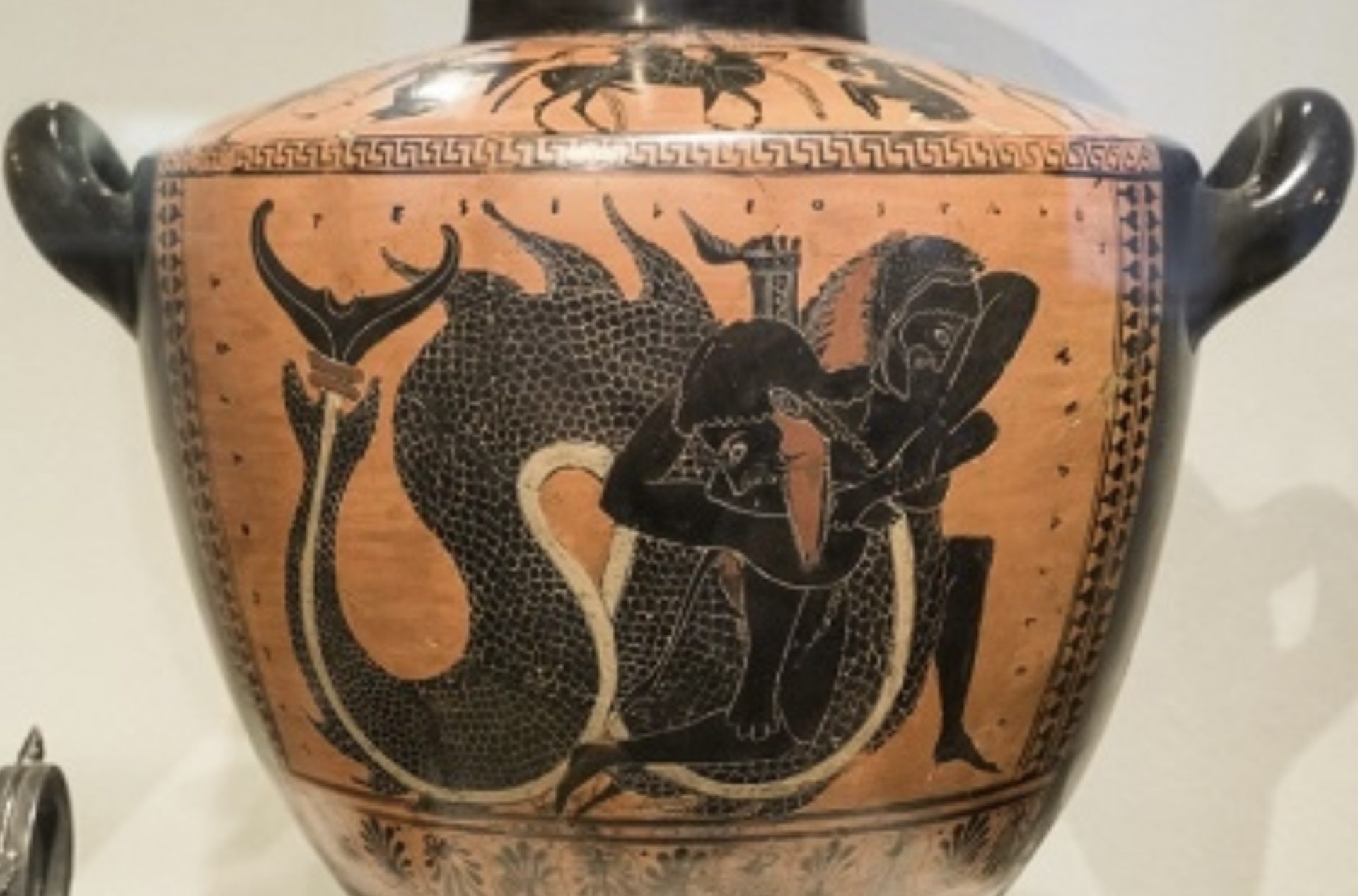 Τρίτωνας που κρατάει σκήπτρο και δελφίνι. Ερυθρόμορφος αμφορέας του Ζωγράφου του Βερολίνου, 500-470 π.Χ., Harvard Art Museums
