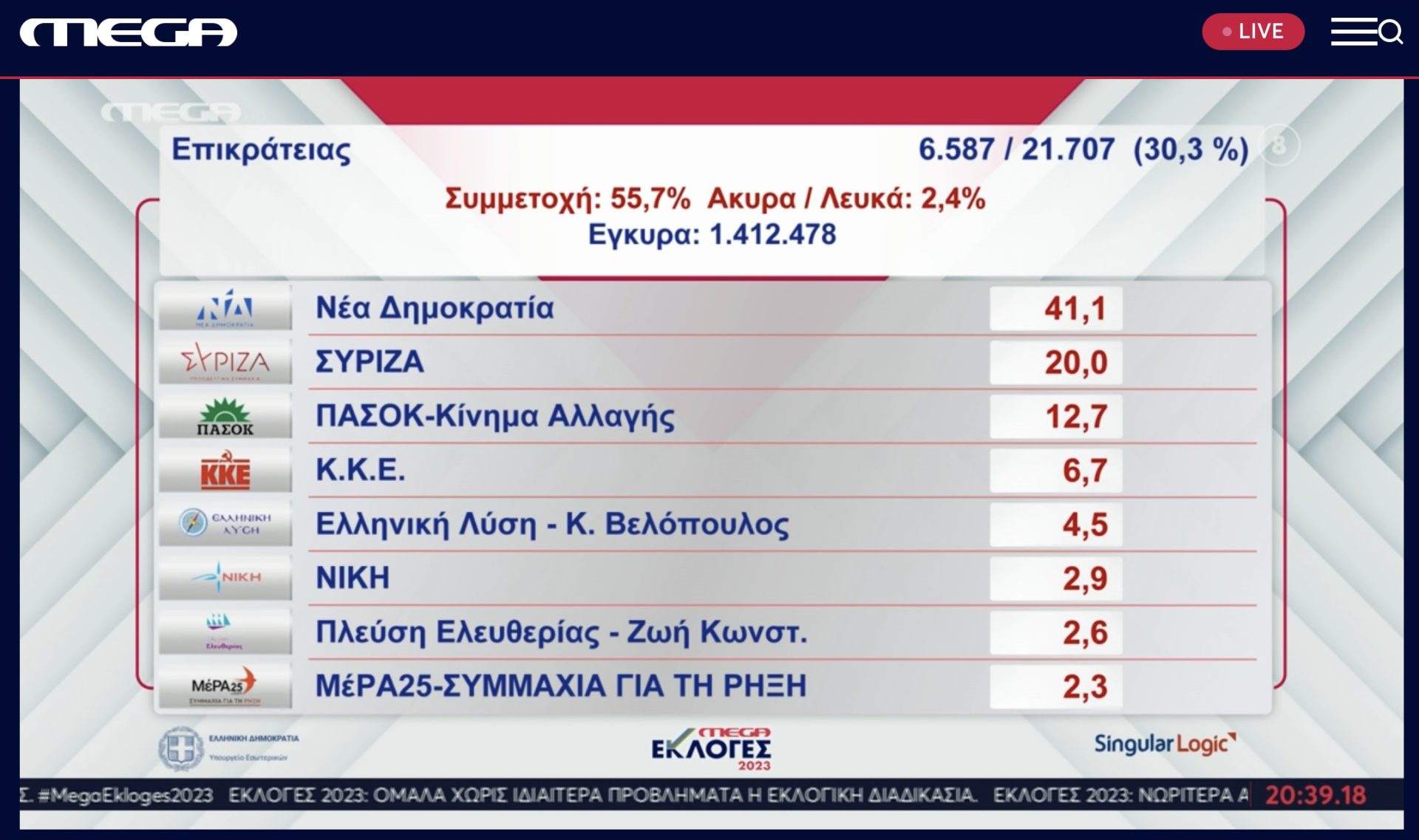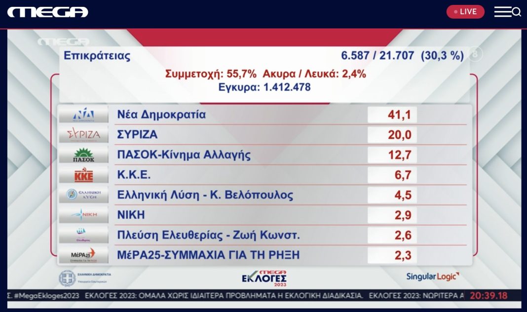 Τη μεγάλη νίκη της Νέας Δημοκρατίας που είχε αποτυπώσει το exit poll, επιβεβαίωσε η πρώτη εκτίμηση των αποτελεσμάτων για τις σημερινές εκλογές που έδωσε η Singular Logic το βράδυ της Κυριακής.