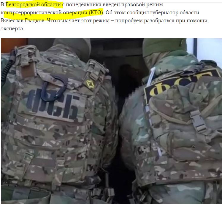«Τέτοιες προϋποθέσεις για τη θέσπιση αυτού του μέτρου, που έχουν προκύψει σήμερα, δεν υπήρχαν πριν. Γεγονός είναι ότι η απόφαση εισαγωγής του στρατιωτικού νόμου λαμβάνεται από τον επικεφαλής του ομοσπονδιακού εκτελεστικού οργάνου στον τομέα της ασφάλειας. Δεν υπήρχε καμία είσοδος ουκρανικών μονάδων δολιοφθοράς στο έδαφος της περιοχής Μπέλγκοροντ στο παρελθόν, επομένως δεν υπήρχε λόγος να εισαχθεί το καθεστώς αυτό. Τώρα βρισκόμαστε αντιμέτωποι με το γεγονός ότι πραγματικές ομάδες μάχης έχουν διεισδύσει στο έδαφός μας και αντιδρούν ανάλογα.