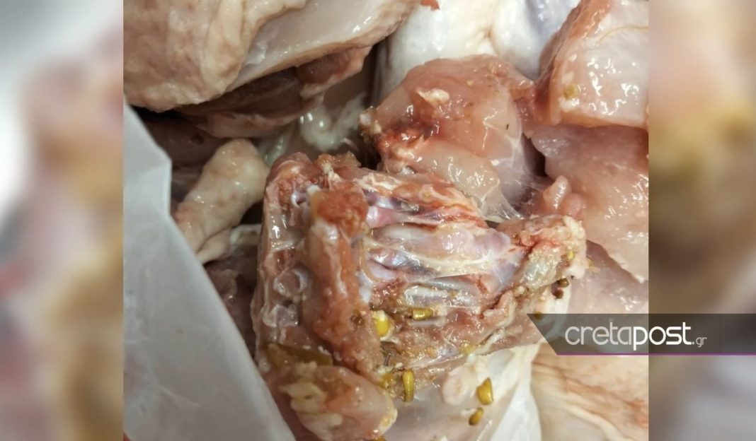 Όπως καταγγέλλει η ίδια στο cretapost, η γυναίκα αγόρασε ένα κοτόπουλο από γνωστό κρεοπωλείο του Ηρακλείου και όταν ξεκίνησε να το καθαρίζει στην κουζίνα της, διαπίστωσε ότι το κρέας ήταν γεμάτο σκουλήκια και τροφές.
