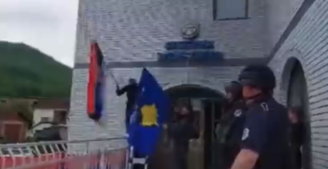 Οι Αλβανοί κατεβάζουν την σημαία της Σερβίας και ανεβάζουν το σύμβολο του αποκαλούμενου κράτους του Κοσόβου στο δημαρχείο του Ζουμπίν Ποτόκ, δυτικά της Μιτρόβιτσα.