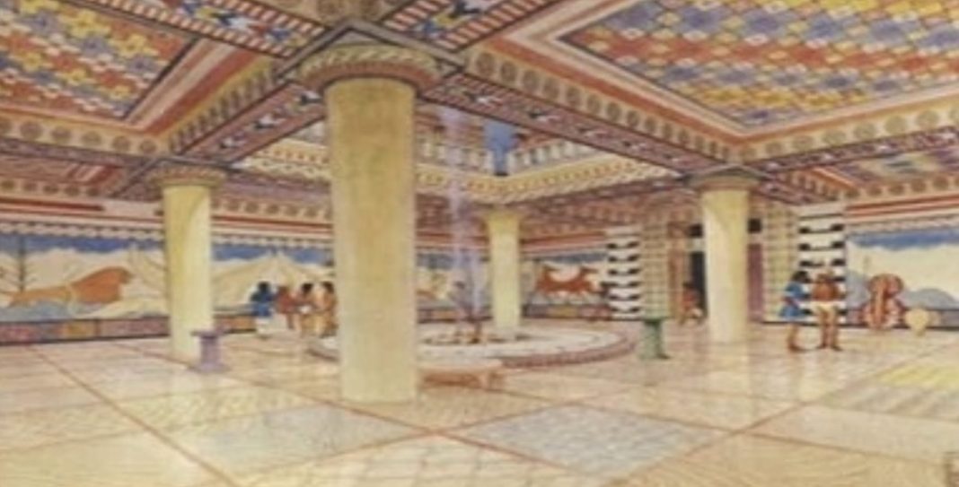Η Αίθουσα του Θρόνου του παλατιού της Πύλου, όπως δημιουργήθηκε από τον Piet de Jong του τμήματος κλασικών σπουδών του πανεπιστημίου Cincinnati. Τα δάπεδα των ελληνικών παλατιών της Εποχής του Χαλκού γίνονταν από ασβεστοκονίαμα που συνήθως ήταν ζωγραφισμένα κομμάτια με έντονα χρώματα και πλεγμένα μεταξύ τους αποδίδοντας σχέδια ή θαλάσσιες μορφές ζώων.