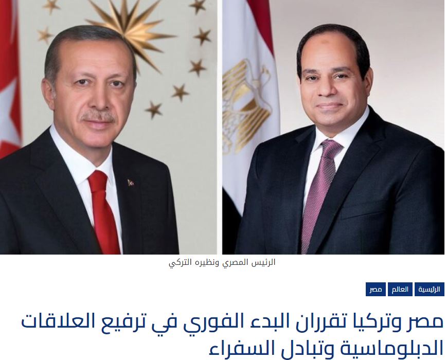 Ο πρόεδρος της Αιγύπτου Αμπντέλ Φατάχ Ελ Σίσι και ο Τούρκος ομόλογός του Ρετζέπ Ταγίπ Ερντογάν αποφάσισαν να ξεκινήσουν άμεσα την αναβάθμιση των διπλωματικών σχέσεων μεταξύ των δύο χωρών και την ανταλλαγή πρεσβευτών.
