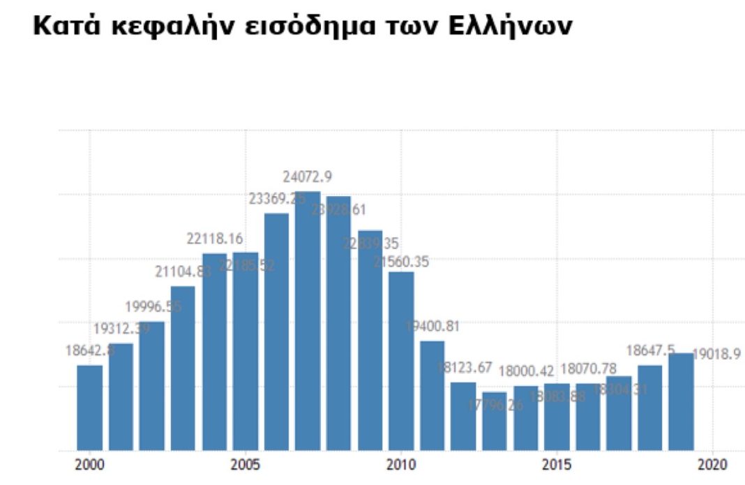 Τέλος, όσον αφορά το κατά κεφαλήν εισόδημα των Ελλήνων, όταν ευρίσκεται στα επίπεδα του 2001, παρά τον πληθωρισμό έκτοτε, αποτελεί τη μεγαλύτερη απόδειξη της οικονομικής πολιτικής της συμφοράς – η οποία δυστυχώς όχι μόνο συνεχίζεται, αλλά επιδεινώνεται.