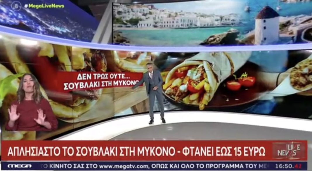 Στα 15 ευρω φτάνει η τιμή για να ένα τυλιχτό σουβλακι με πιτα και γύρο ή χοιρινό καλαμάκι μεσα. Ακόμη και ο Νίκος Ευαγγελατος δεν πίστευε σε αυτά που έβλεπε. Και ακόμη είμαστε στην αρχή της τουριστικής περιόδου.