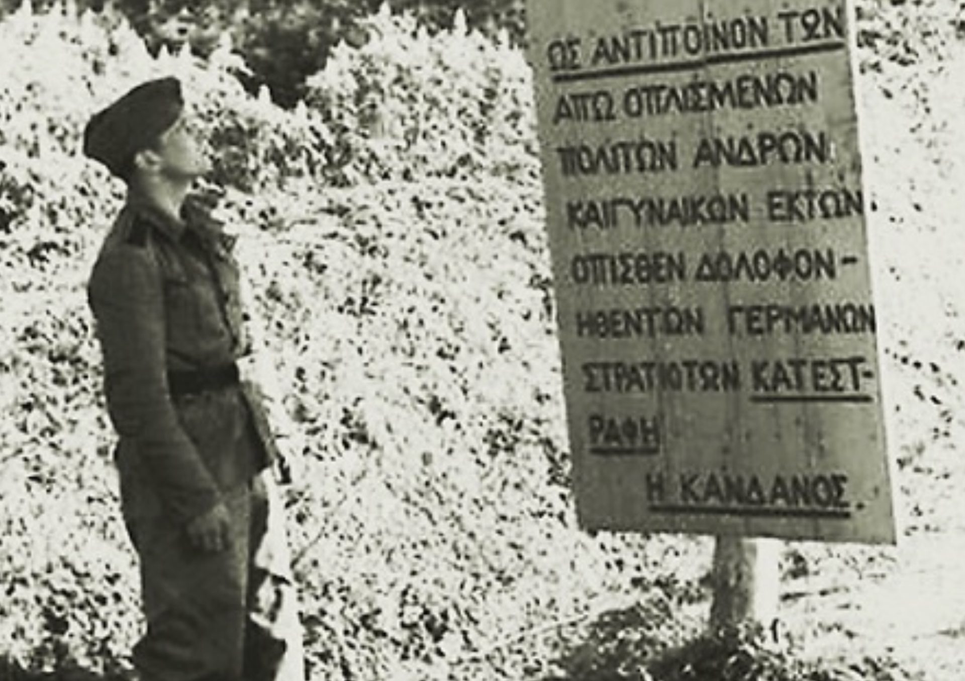 Δια την κτηνώδη δολοφονίαν γερμανών αλεξιπτωτιστών, αλπινιστών και του Μηχανικού, από άνδρας γυναίκας, παιδιά και παπάδες μαζί και διότι τόλμησαν να αντισταθούν κατά του Μεγάλου Ράιχ, κατεστράφη την 3η-6-1941 η Κάνδανος εκ θεμελίων δια να μη επανοικοδομηθή πλέον ποτέ.