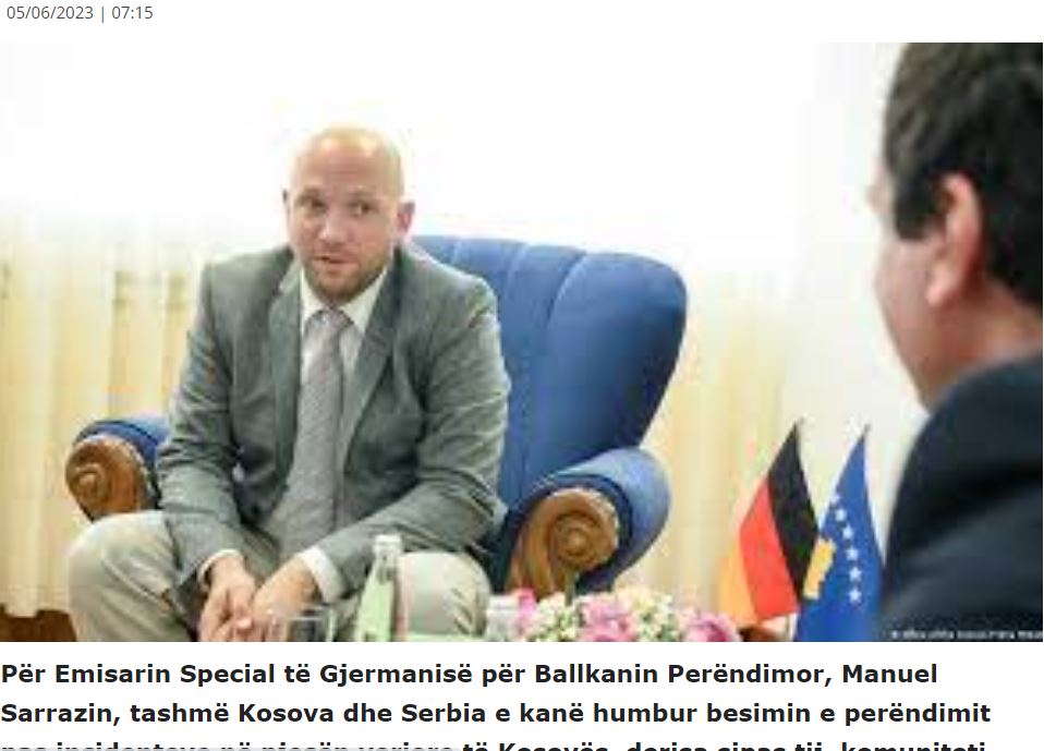 Ο Ειδικός Απεσταλμένος της Γερμανίας στα Δυτικά Βαλκάνια, Μανουέλ Σαραζίν, τόνισε ότι η Δύση έχει χάσει την εμπιστοσύνη της στο Κόσοβο μετά τα επεισόδια στο βόρειο τμήμα του Κοσσυφοπεδίου, ενώ σύμφωνα με τον ίδιο, η διεθνής κοινότητα είναι «πολύ θυμωμένη και απογοητευμένη».