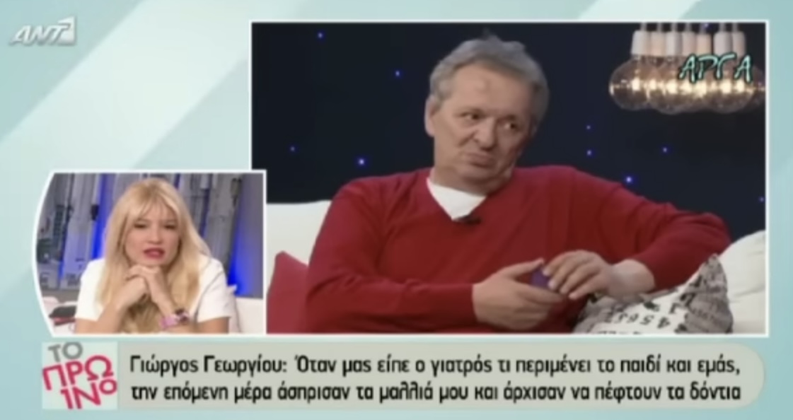 «Το πρωί που σηκώθηκα να πάω να πλυθώ, κοιτάζω στον καθρέπτη και βλέπω τα μαλλιά μου άσπρα. Αρχίζω να μασάω ψωμί ψίχα και να σπάνε τα δόντια μου» εξομολογήθηκε στη συνέχεια ο Γιώργος Γεωργίου. Αυτός είναι και ο λόγος -όπως είχε αποκαλύψει σε παλαιότερη συνέντευξή του- που δεν έφτιαξε ποτέ τα δόντια του, για να του θυμίζει ακριβώς το δυσάρεστο γεγονός εκείνης της ημέρας.