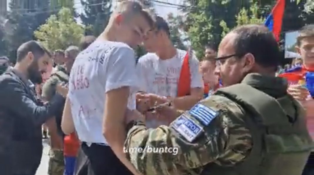 Στην εικόνα Έλληνας στρατιώτης των νατοϊκών δυνάμεων στο Κοσσυφοπέδιο, υπογραφή σε μπλουζάκια αποφοίτων από τα σερβικά σχολεία…