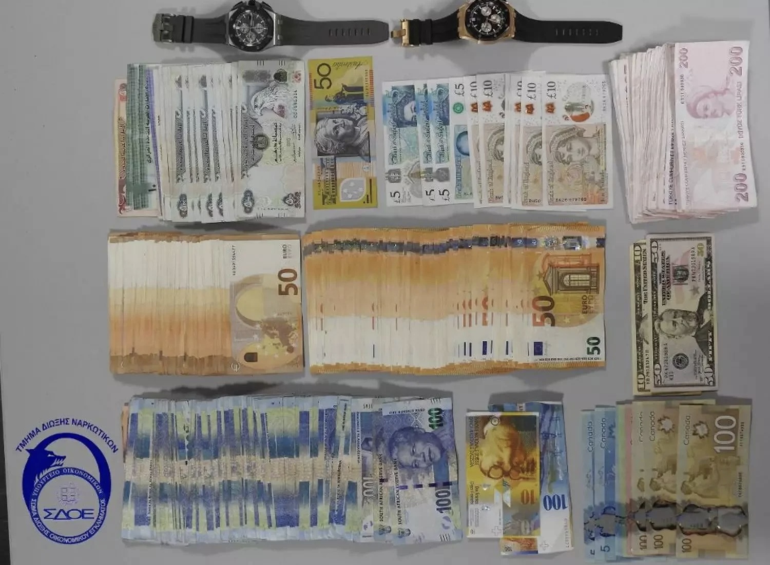 Σε έρευνα που διενεργήθηκε στην κατοικία του συλληφθέντα, βρέθηκαν και κατασχέθηκαν χρηματικά ποσά σε χαρτονομίσματα προερχόμενα από διάφορες χώρες, μεταξύ των οποίων ευρώ, δολάρια ΗΠΑ, δολάρια Καναδά , δολάρια Αυστραλίας, ελβετικά φράγκα, λίρες Τουρκίας, Dirhams Ηνωμένων Αραβικών Εμιράτων και Rand Νοτίου Αφρικής.