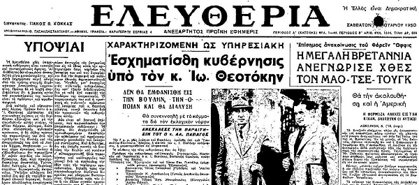 Τον Δεκέμβριο του 1935 ο Ιωάννης Θεοτόκης ίδρυσε το Εθνικό Λαϊκό Κόμμα, στο οποίο προσχώρησαν 40 βουλευτές. Στις εκλογές του Ιανουαρίου του 1936, το κόμμα του Θεοτόκη συνεργάστηκε με το Εθνικό Ριζοσπαστικό Κόμμα του Γ. Κονδύλη και άλλους ανεξάρτητους βουλευτές συγκροτώντας τη Γενική Ριζοσπαστική Λαϊκή Ένωση, η οποία κέρδισε 60 έδρες στη νέα βουλή. Στο πρώτο εξάμηνο του 1936 ο Θεοτόκης κατέστη ο βασικός εκπρόσωπος της αντιβενιζελικής παράταξης. Προκειμένου να αποφευχθεί πολιτική κρίση συμφώνησε στο σχηματισμό κυβέρνησης συνεργασίας με τον Θεμιστοκλή Σοφούλη, ηγέτη της φιλελεύθερης παράταξης.