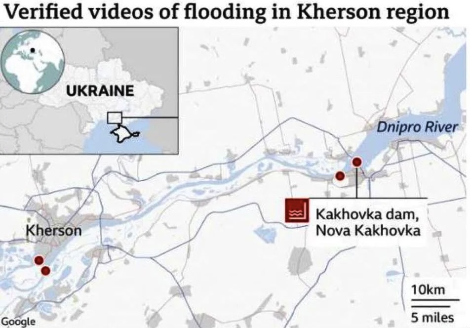 Σύμφωνα με το Κίεβο, ο ρωσικός στρατός ανατίναξε το φράγμα, για να προσπαθήσει να «ανακόψει» την επικείμενη αντεπίθεση την οποία ο ουκρανικός στρατός ετοιμάζει εδώ και μήνες, με στόχο να ανακαταλάβει όλα τα εδάφη στο νότιο και το ανατολικό τμήμα της Ουκρανίας που βρίσκονται υπό ρωσική κατοχή.