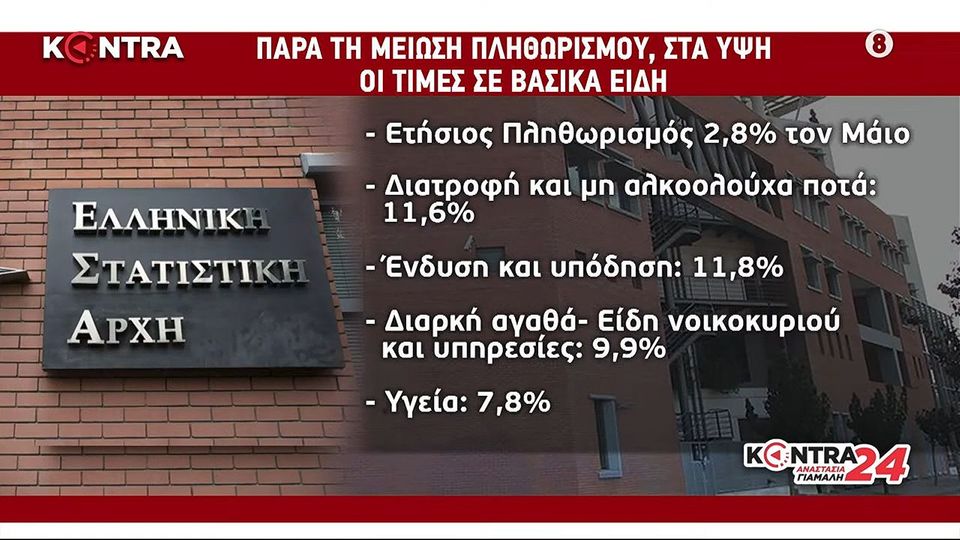 Σύμφωνα με τα στοιχεία της Ελληνικής Στατιστικής Αρχής, ο πληθωρισμός τον Μάιο υποχώρησε στο 2,8% (από 3% τον Απρίλιο). Ομως οι τιμές των τροφίμων συνέχισαν να “καλπάζουν”, σημειώνοντας άνοδο 11,6% κατά μέσο όρο. Ακόμη περισσότερο (+18%) αυξήθηκαν οι τιμές των φαρμάκων!