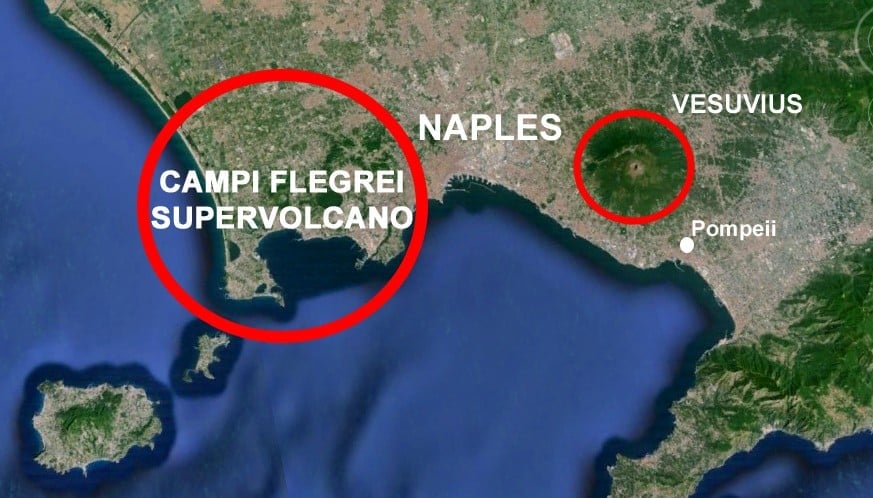 Τα Φλεγραία Πεδία (Campi Flegrei) είναι μια μεγάλη καλντέρα διαμέτρου 13 χιλιομέτρων κοντά στη Νάπολη. Το ψηλότερο σημείο της βρίσκεται 458 μέτρα πάνω από την επιφάνεια της θάλασσας. Το μεγαλύτερο μέρος του ηφαιστείουείναι υποθαλάσσιο και αποτελείται από 24 κρατήρες και ηφαιστειακά οικοδομήματα. Σύμφωνα με ενδείξεις, το ηφαίστειο διαθέτει ένα τεράστιο θάλαμο μάγματος από κοινού με τον Βεζούβιο σε βάθος 8 χιλιομέτρων χωρητικότητας μεγαλύτερη από 100 κυβικά χιλιόμετρα, γεγονός που κατατάσσει τα Φλεγραία Πεδία στα υπερηφαίστεια. Μια πιθανή έκρηξή του θα σημαίνει ότι εκατομμύρια άνθρωποι θα πεθάνουν (η πόλη της Νάπολης είναι κτισμένη μέσα στην καλντέρα των Φλεγραίων Πεδίων), ενώ το κλίμα θα επηρεαστεί σε παγκόσμια κλίμακα.