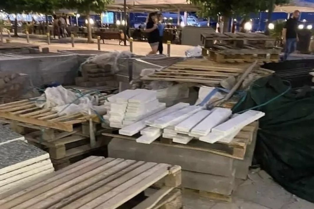 Οι παρακάτω φωτογραφίες από την ανάπλαση δείχνουν ότι σαν υλικά χρησιμοποιούνται μάρμαρα από τάφο.