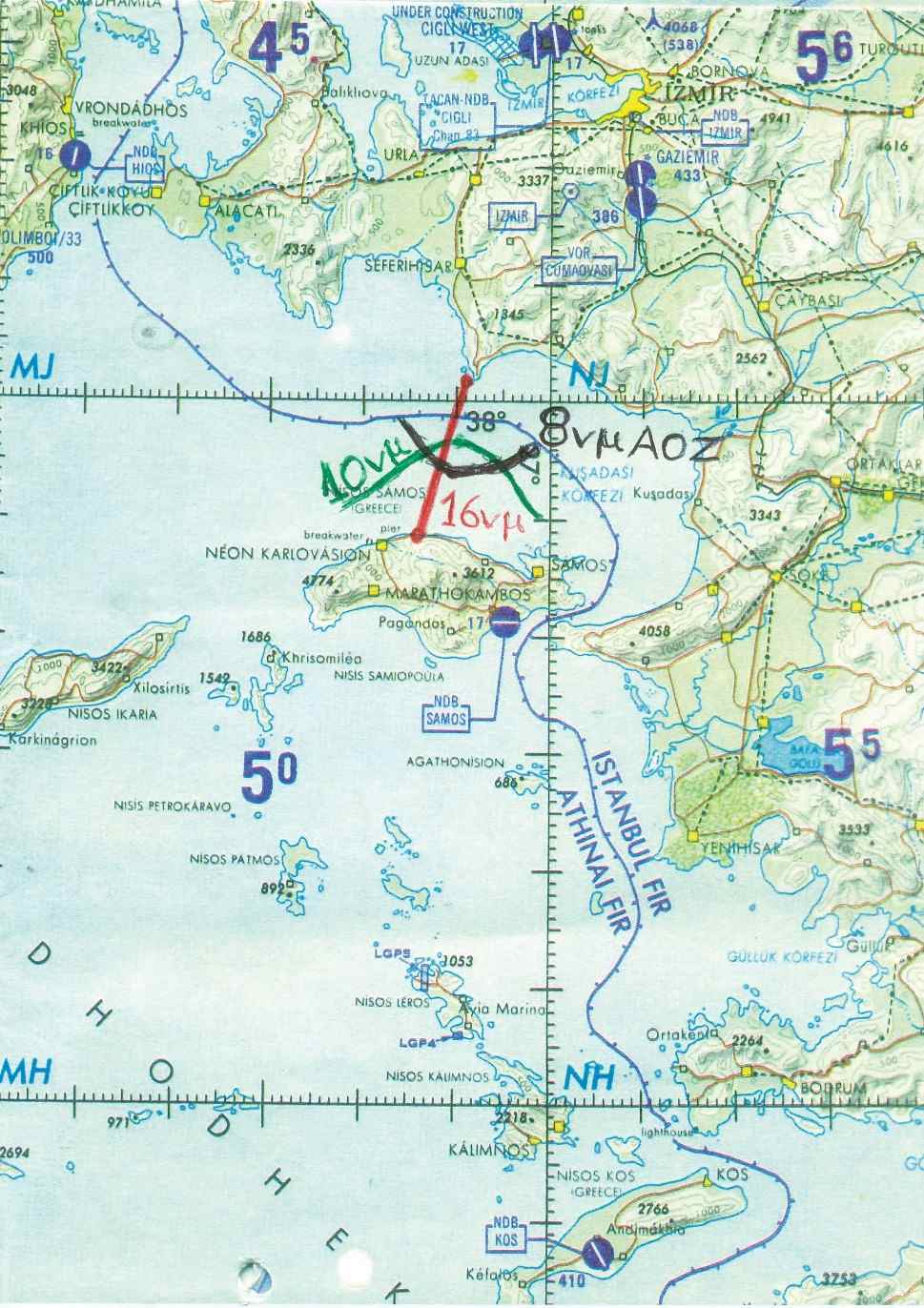 Οπως φαίνεται στον Χάρτη 2, η απόσταση, με κόκκινο, από τη βόρεια Σάμο μέχρι τις τουρκικές ακτές είναι 16 ν.μ. και η μέση γραμμή της ΑΟΖ είναι 8 ν.μ. για κάθε χώρα. Ο ελληνικός εθνικός εναέριος χώρος (με πράσινο χρώμα) είναι 10 ν.μ. και η μέση γραμμή της ΑΟΖ της Τουρκίας με μαύρο χρώμα είναι 8 ν.μ. Ετσι, ο ΕΕΧ των 10 ν.μ. επικαλύπτει 2 ν.μ. την τουρκική ΑΟΖ. Δηλαδή, στη θάλασσα υπάρχει τουρκική ΑΟΖ 8 ν.μ. (τουρκικό κυριαρχικό δικαίωμα) και από πάνω (επικάλυψη) ελληνικός εναέριος χώρος 10 ν.μ., ενώ το ίδιο ισχύει για τη Σαμοθράκη κ.λπ.
