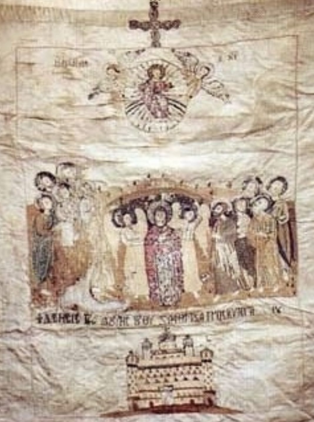 Φωτογραφία: Λάβαρο του 1821 στο Παλαιοχώρι Χαλκιδικής. Αντίγραφο δισδιάστατης εικόνας. Το Λάβαρο των Μακεδονικών δυνάμεων της Ελληνικής Επανάστασης του 1821, που υψώθηκε στη μάχη της Ρεντίνας, στις 15 Ιουνίου 1821, στη Μακεδονία