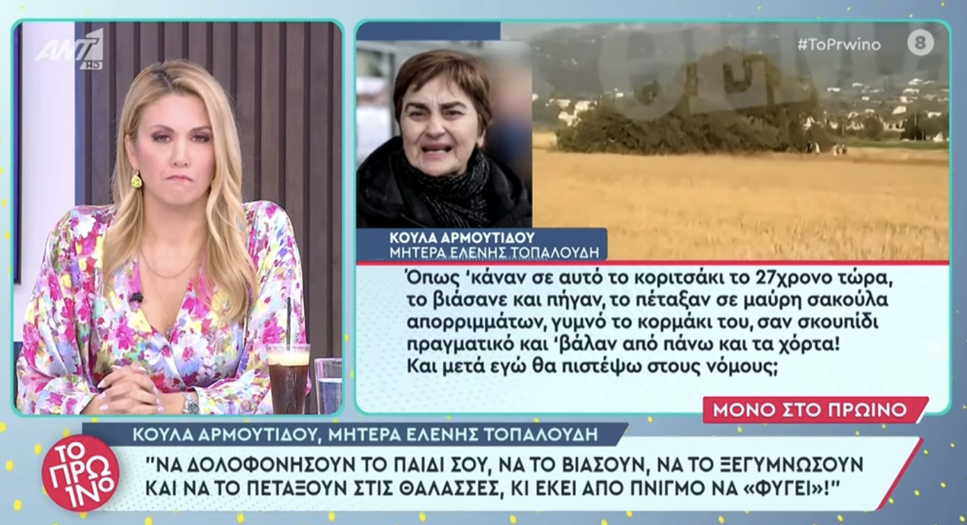 Η Κούλα Αρμουτίδου ξεσπά και παραδέχεται ότι «έχει γίνει λιώμα αυτές τις ημέρες», και συνεχώς όλα όσα συμβαίνουν με τις γυναικοκτονίες στη χώρα δεν μπορεί με τίποτα να ξεπεράσει τον άδικο χαμό του παιδιού της στη Ρόδο, τον Νοέμβριο του 2018, όταν βιάστηκε και πετάχτηκε σε βραχώδη περιοχή, όπου και ξεψύχησε. «Έχω γίνει λιώμα αυτές τις ημέρες… Έχω γίνει. Η ψυχή μου έγινε κατάμαυρη, μας ξύνουν τις πληγές κάθε τόσο”, είπε με δάκρυα στα μάτια η μητέρα της Ελένης Τοπαλούδη.