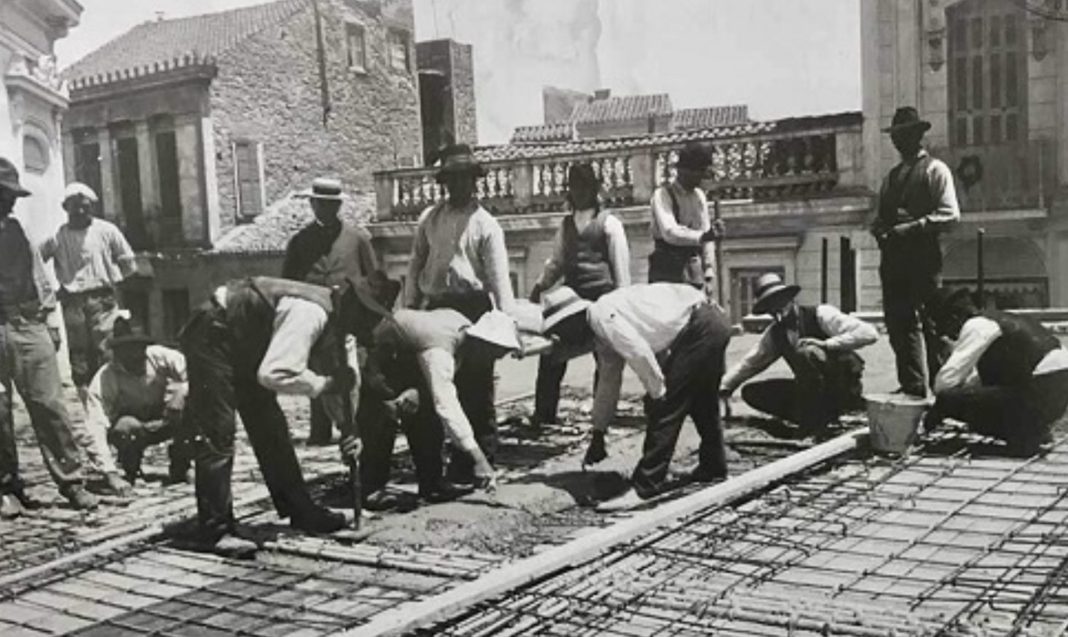 Φωτογραφία: Ο Ανδρέας Κ. Δρακόπουλος, τρίτος από αριστερά με το ψάθινο καπέλο, επιβλέπει εργασίες στην καρδιά της αστικής Αθήνας, τη δεκαετία του 1920.