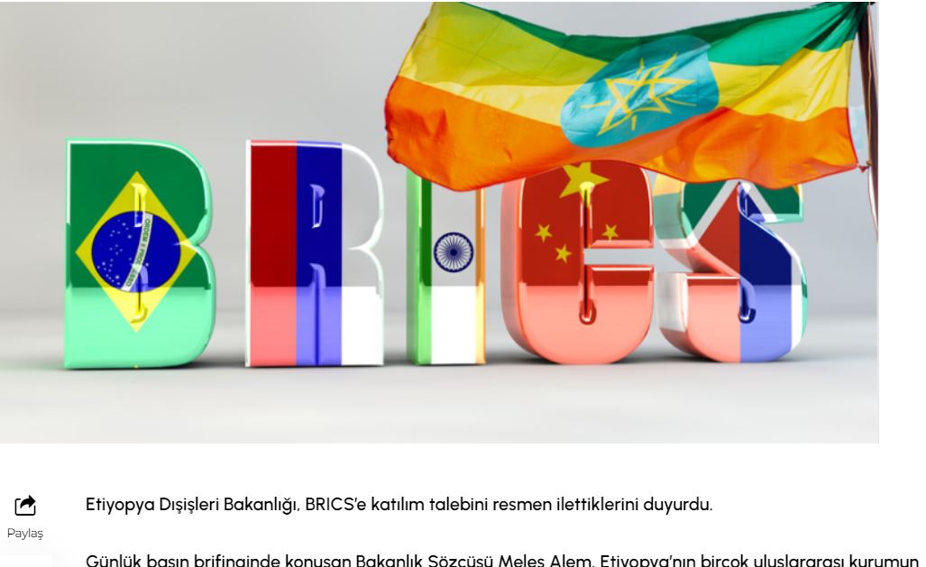 Ο Μελές Αλέμ, εκπρόσωπος του Υπουργείου Εξωτερικών της Αιθιοπίας, δήλωσε ότι οι αρχές της χώρας υπέβαλαν επίσημα αίτηση για ένταξη στον μηχανισμό συνεργασίας BRICS.