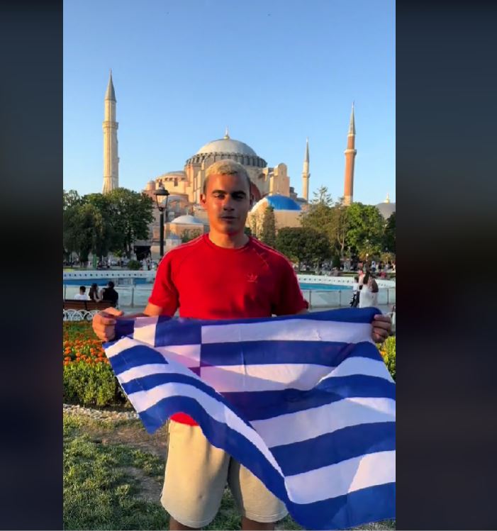 Ο ‘Μάικ Κονδύλας’- όπως γράφουν τα τούρκικα media, πόζαρε με την ελληνική σημαία μπροστά από την Αγία Σοφία, η οποία άνοιξε ξανά ως τζαμί το 2020 κατόπιν εντολής του Προέδρου Ερντογάν και μοιράστηκε: