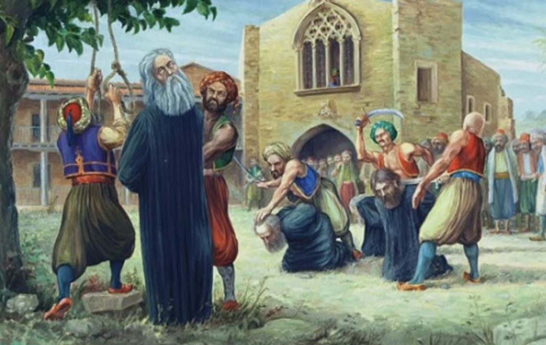 Στις 9 Ιουλίου 1821, ο αρχιεπίσκοπος Κύπρου Κυπριανός απαγχονίστηκε στην πλατεία Διοικητηρίου της Λευκωσίας κάτω από μία μουριά, ενώ την ίδια ημέρα καρατομήθηκαν οι τρεις μητροπολίτες της Κύπρου, ο Πάφου Χρύσανθος, ο Κιτίου Μελέτιος και ο Κυρηνίας Λαυρέντιος, καθώς και άλλοι κληρικοί. Την επομένη και ως τις 14 Ιουνίου αποκεφαλίστηκαν και οι υπόλοιποι του καταλόγου, εκτός από 36 που αλλαξοπίστησαν.