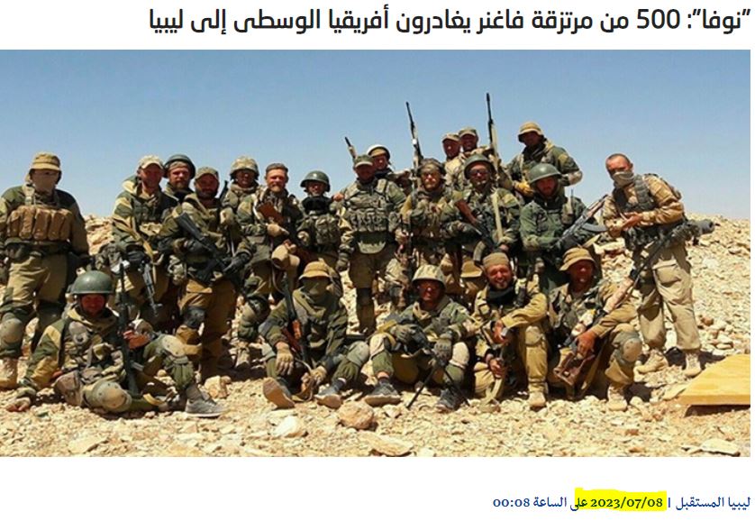 Η τοπική εφημερίδα της Κεντροαφρικανικής Δημοκρατίας- CAR, «Obangui Medias», αποκάλυψε ότι περίπου 500 μισθοφόροι της ρωσικής παραστρατιωτικής ομάδας Βάγκνερ είναι πιθανό να εγκαταλείψουν την Κεντροαφρικανική Δημοκρατία και να μετακινηθούν στη Λιβύη.