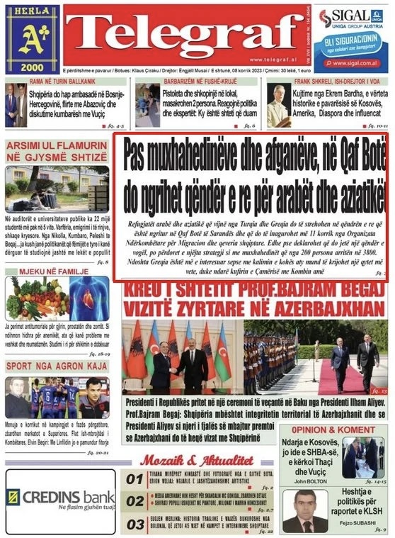 «Μετά τους Μουτζαχεντίν και τους Αφγανούς, ένα νέο κέντρο για Άραβες και Ασιάτες θα κατασκευαστεί στο Qaf Bote». Με αυτόν τον τίτλο στο πρωτοσέλιδό της, η αλβανική εφημερίδα Telegraf αναφέρεται στο νέο κέντρο φιλοξενίαςπροσφύγων/μεταναστών που θα εγκαινιαστεί στη χώρα την προσεχή Τρίτη και το οποίο βρίσκεται «μια ανάσα» από τα σύνορα με την Ελλάδα.
