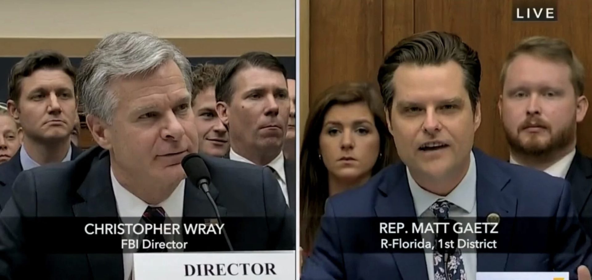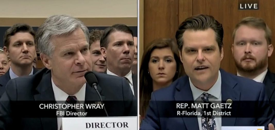 Ο διευθυντής του FBI, Ρέι, εκνευρίζεται εμφανώς όταν ο Βουλευτής των Ρεπουμπλικάνων Ματ Γκάετς τον κατηγορεί κατά προσωπο για συγκάλυψη της «οικογένειας του εγκλήματος» Μπάιντεν, διαβάζοντας ένα μήνυμα που στάλθηκε μέσω WhatsApp από τον Χάντερ Μπάιντεν σε Κινέζο αξιωματούχο.