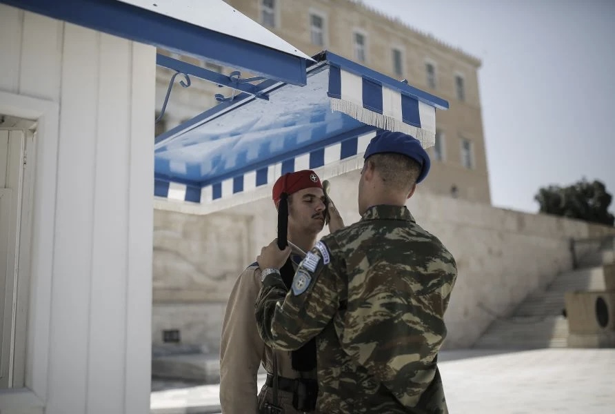 Σε φωτογραφίες που δημοσίευσε το ΑΠΕ-ΜΠΕ, απεικονίζεται ένας αξιωματικός να προσφέρει νερό στους εύζωνες και να σκουπίζει τον ιδρώτα τους.