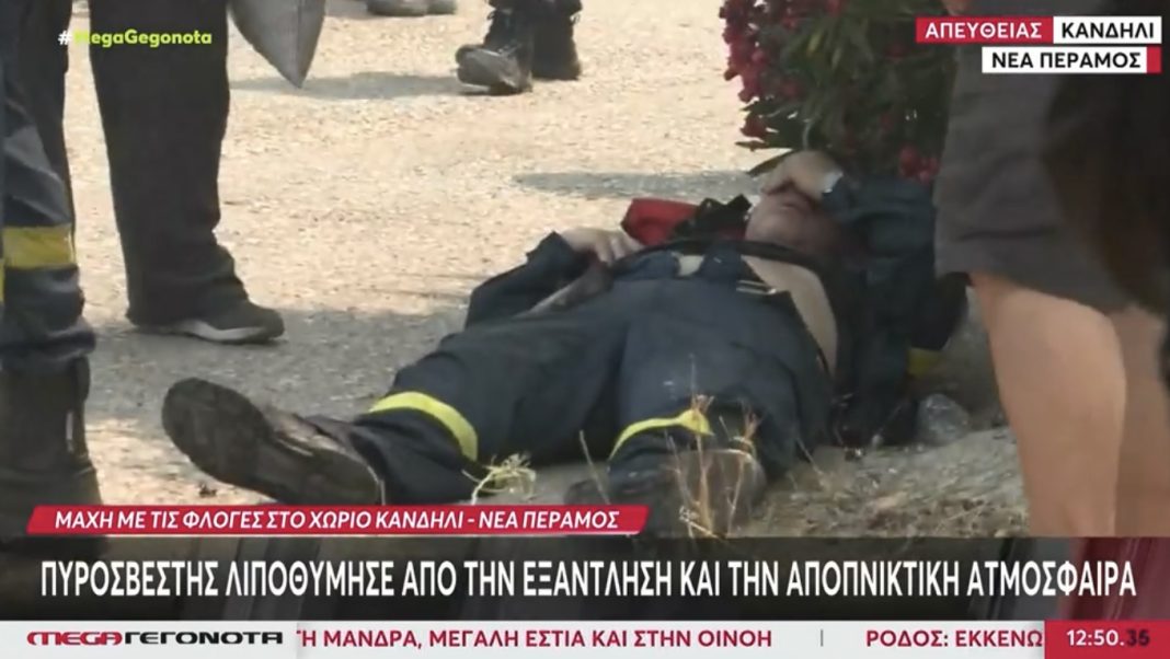 Στην ώρα της υπεροπροσπάθειας στο χωριό Κανδήλι στην περιοχή της Νέας Περάμου, όπου Πυροσβέστες, εθελοντές και κάτοικοι έκαναν υπερπροσπάθεια να κρατήσουν τις φλόγες, ένας Πυροσβέστης δεν ένιωσε καλά και κατέρρευσε πέφτοντας λιπόθυμος στο έδαφος δίπλα στο πυροσβεστικό όχημα.