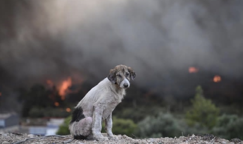 Τον γύρο των μέσων κοινωνικής δικτύωσης κάνει η συγκλονιστική φωτογραφία με τον σκύλο που κοιτάζει λυπημένος τον φακό, ενώ πίσω του διακρίνονται φλόγες από το πύρινο μέτωπο στα Δερβενοχώρια που έφτασε σε Οινόη -Μαγούλα.