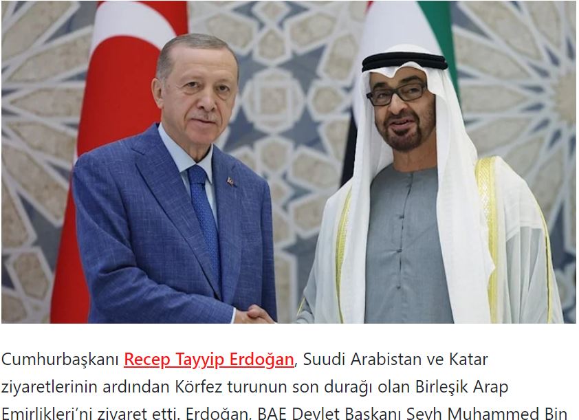 Ο Πρόεδρος Ρετζέπ Ταγίπ Ερντογάν επισκέφθηκε τα Ηνωμένα Αραβικά Εμιράτα, τον τελευταίο σταθμό της περιοδείας του στον Κόλπο, μετά τις επισκέψεις του στη Σαουδική Αραβία και το Κατάρ. Τον Ερντογάν υποδέχθηκε με επίσημη τελετή ο πρόεδρος των ΗΑΕ, Σεΐχης Μοχάμεντ Μπιν Ζαγιέντ Αλ Ναχιάν. Οι δύο ηγέτες πραγματοποίησαν κατ’ ιδίαν συνάντηση μεταξύ των αντιπροσωπειών.