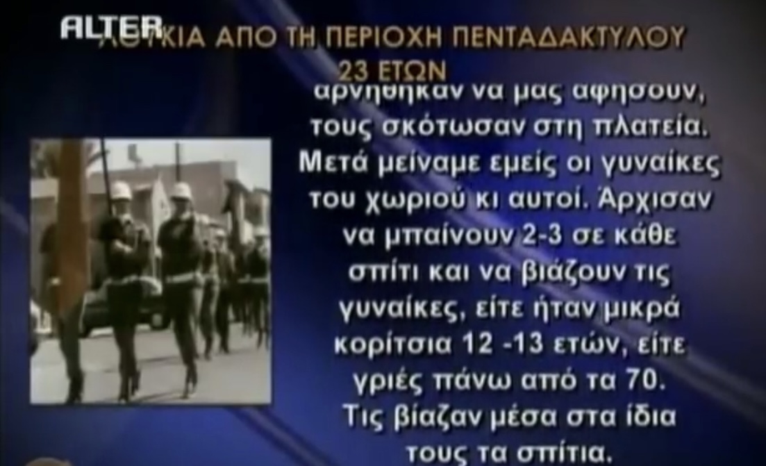 «Μπήκαν μέσα στο σπίτι, έβγαλαν με τη βία έξω τον άντρα και τα μικρά μου παιδιά. Τα παιδιά προσπαθούσαν να έρθουν στην αγκαλιά μου και αυτοί τα κλωτσαγαν και τα κοπάναγαν με τα όπλα. Ο τούρκος αξιωματικός με έβαλε μέσα στο σπίτι, με χτύπησε με το όπλο και άρχισε να μου σκίζει τα ρούχα. Κάποια στιγμή κατάφερα να ξεφύγω και έτρεξα γυμνή στην αυλή, εκεί που ήταν ακόμα ο άντρας και τα παιδιά μου υπό την απειλή των όπλων. Ο τούρκος αξιωματικός με πρόλαβε και με βίασε μπροστά στα μάτια του άντρα μου και των παιδιών μου».