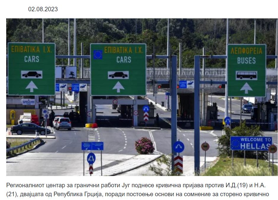 Τα μέσα ενημέρωσης των Σκοπίων αναφέρουν ότι το Περιφερειακό Κέντρο Συνοριακών Υποθέσεων Νότου, κατέθεσε ποινική μήνυση σε βάρος των Ι.Δ.(19) και Ν.Α.(21), αμφότεροι από τη Δημοκρατία της Ελλάδας, για μυστηριώδη παράνομη διέλευση των κρατικών συνόρων.