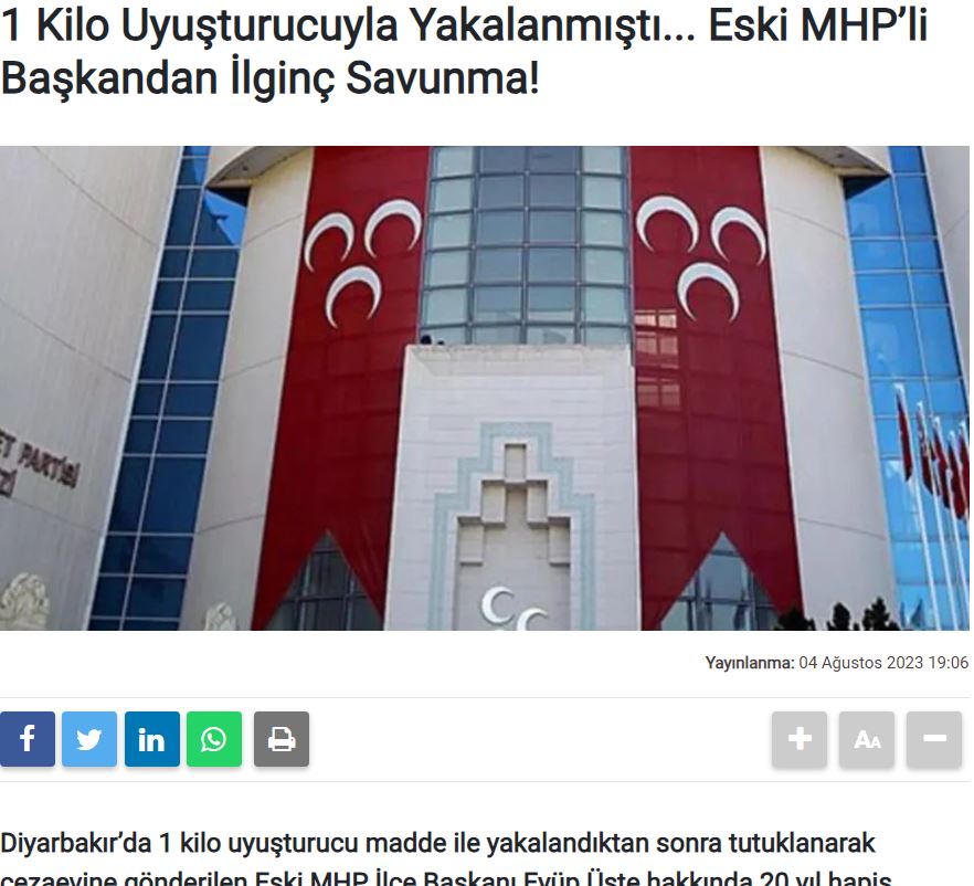 «Δεν τα πουλάω, τα έχω για μένα», ισχυρίστηκε ο πρώην πρόεδρος του Εθνικιστικού Κόμματος – MHP, της περιφέρειας του Μπιτλίς, Ειούπ Ούστε, που συνελήφθη με ένα κιλό ναρκωτικών αγοραίας αξίας 4 εκατομμυρίων TL, κατά τη διάρκεια έρευνας που διεξήγαγαν αστυνομικές δυνάμεις στον αυτοκινητόδρομο Ντιγιαρμπακίρ- Σανλιούρφα, σύμφωνα με τούρκικο δημοσίευμα.