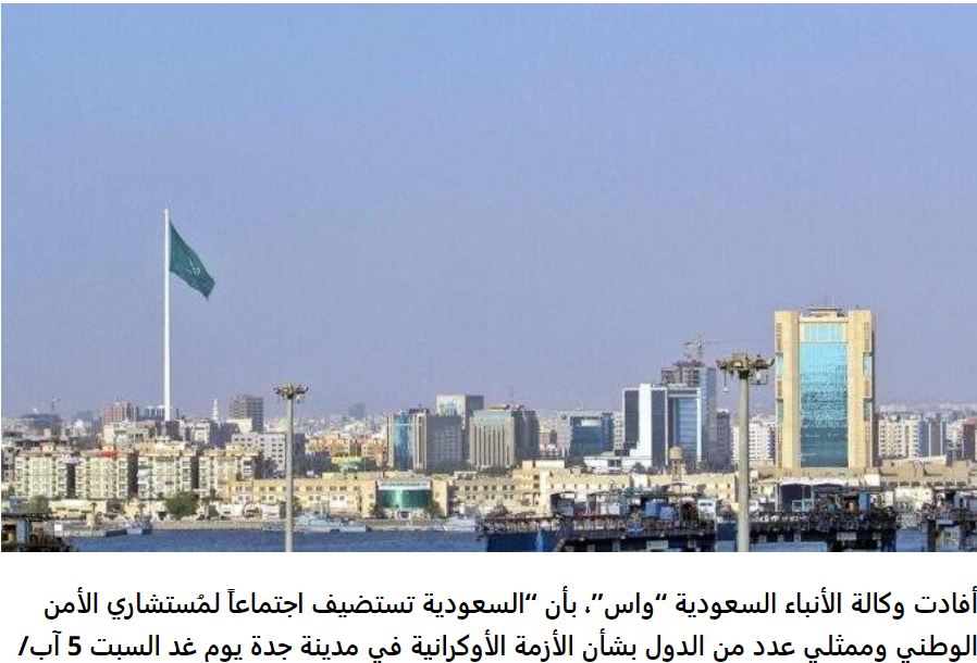 Το ειδησεογραφικό πρακτορείο της Σαουδικής Αραβίας, «SPA», ανέφερε ότι «η Σαουδική Αραβία φιλοξενεί μια συνάντηση συμβούλων εθνικής ασφάλειας και εκπροσώπων ορισμένων χωρών σχετικά με την ουκρανική κρίση στην πόλη Τζέντα, σήμερα, Σάββατο 5 Αυγούστου 2023».