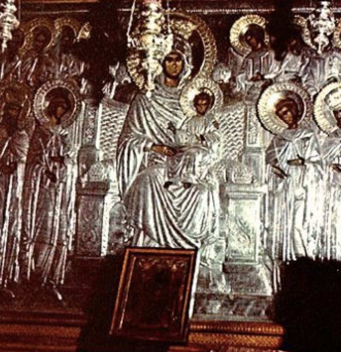 Κάποτε, είχε ενσκήψει λιμός στη, Λαύρα του Αθανασίου, και όλοι οι αδελφοί διασκορπίστηκαν προς κάθε κατεύ¬θυνση. Αποκαρδιωμένος ο Αθανάσιος ξεκίνησε να φύγει κι αυτός σε αναζήτηση, άλλου τόπου. Όμως μία γυναίκα τον σταμάτησε στο δρόμο και τον ρώτησε: «Πού πηγαίνεις;» Επειδή αυτή ήταν μία γυναίκα και, ως γνωστόν, το Άγιον Όρος είναι άβατο για όλες τις γυναίκες, έκπληκτος εκείνος ρώτησε: «Ποιά είσαι;» και αυτή απάντησε: «Είμαι εκείνη στην οποία έχεις αφιερώσει τη μοναστική σου αδελφότητα. Είμαι η Μητέρα του Κυρίου σου».