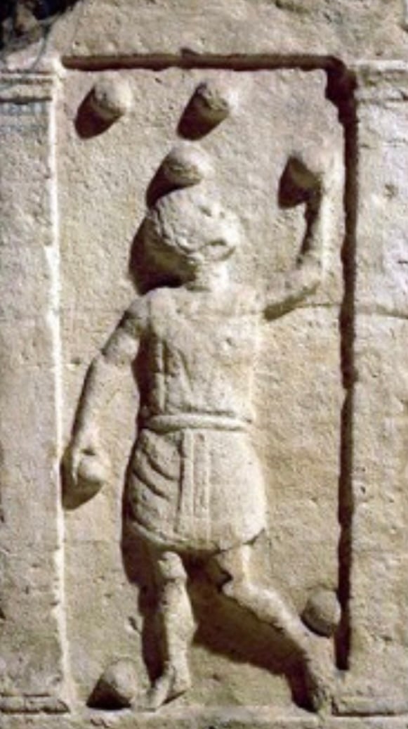 Το παιγνίδι φαίνεται να συνεχίζεται και στα ελληνικά και τα ρωμαϊκά χρόνια. Το ταφικό ανάγλυφο (του 1ου αιώνα μ.Χ.) – στην κορυφή του άρθρου – είναι από την στήλη Settimia Spica, όπου εικονίζεται ένας… ζογκλέρ. Το ανάγλυφο εκτίθετο στο Museo della Civilta Romana. Αλλά αυτό έκλεισε το… 2014 για την «αναμόρφωσή του». Και φαίνεται ότι τα έργα του δεν έχουν αρχίσει ποτέ… Έτσι θάβεται(;) η Ιστορία… και μένει μόνο σε φωτογραφίες…