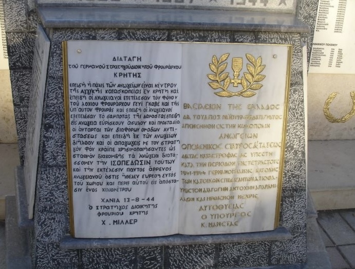 «…Επειδή η πόλις των Ανωγείων είναι κέντρον της αγγλικής κατασκοπίας εν Κρήτη και επειδή οι Ανωγειανοί εξετέλεσαν το φόνο του λοχία φρουράρχου Γενί-Γκαβέ και της υπ’ αυτόν φρουράς και επειδή οι Ανωγειανοί εξετέλεσαν το σαμποτάζ της Δαμάστας, επειδή εις Ανώγεια ευρίσκουν άσυλον και προστασίαν οι αντάρται των διαφόρων ομάδων αντιστάσεως και επειδή εκ των Ανωγείων διήλθον και οι απαγωγείς με τον στρατηγόν Φον Κράιπε χρησιμοποιήσαντες ως σταθμόν διακομιδής τα Ανώγεια, διατάσσομεν την ΙΣΟΠΕΔΩΣΙΝ τούτων και την εκτέλεσιν παντός άρρενος Ανωγειανού όστις ήθελεν ευρεθεί εντός του χωρίου και πέριξ αυτού εις απόστασιν ενός χιλιομέτρου.»