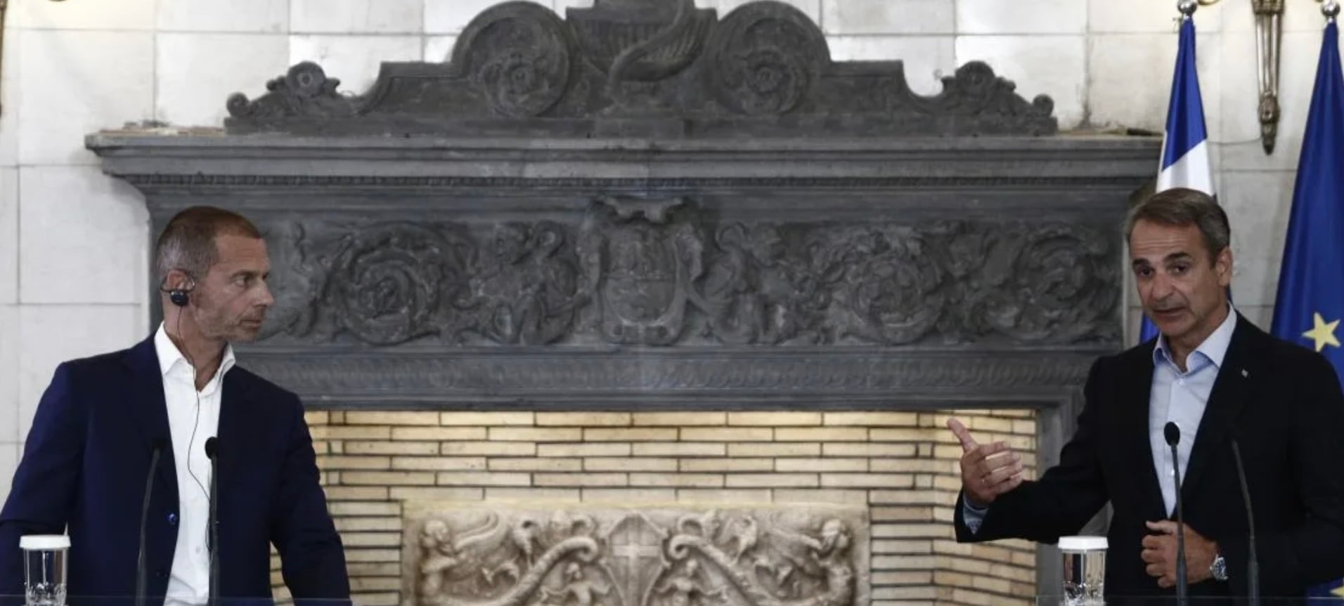 Ολοκληρώθηκαν οι κοινές δηλώσεις του Κυριάκου Μητσοτάκη με τον Πρόεδρο της UEFA Αλεξάντερ Τσέφεριν, μετά το τέλος της σύσκεψης για την οπαδική βία με τη συμμετοχή των και των Big 4 του ελληνικού ποδοσφαίρου (ΑΕΚ, Ολυμπιακός, Παναθηναϊκός, ΠΑΟΚ).